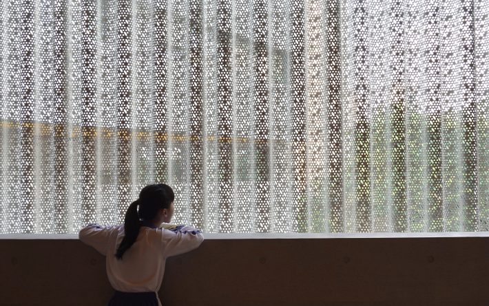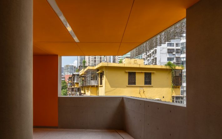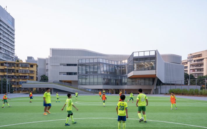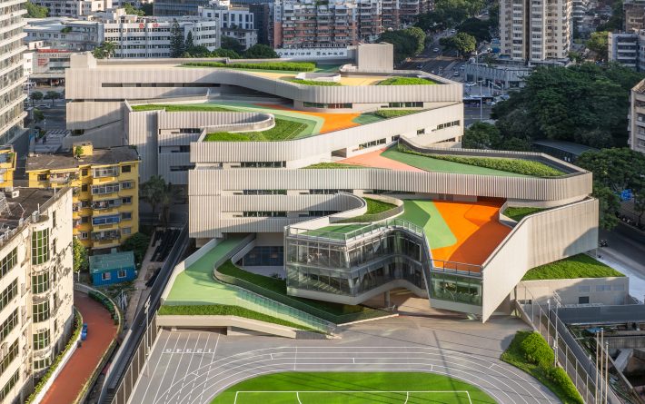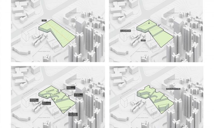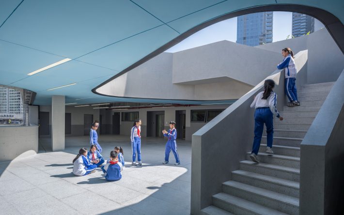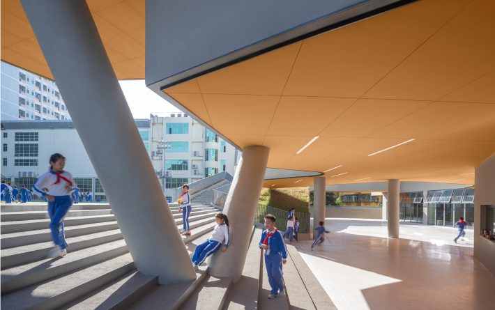翠竹外国语学校的建设场地十分有限。本项目容积率超过3.0,规划班级超过40个,需要特殊的设计,才能减轻如此高密度空间给学生所带来的压迫感。不同于传统封闭式单廊教学楼,翠竹外国语学校采用了开放式自由平面设计,将教室承托在开放式的大平台上,在教室空间外形成一系列供学生活动玩耍的半室外空间。建筑师希望通过这种更加自由的环境带来全新的教育模式,将教学活动拓展到传统的课堂以外,激发学生的创造力。
