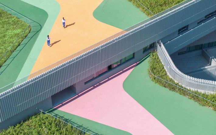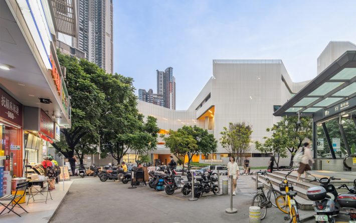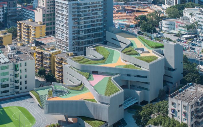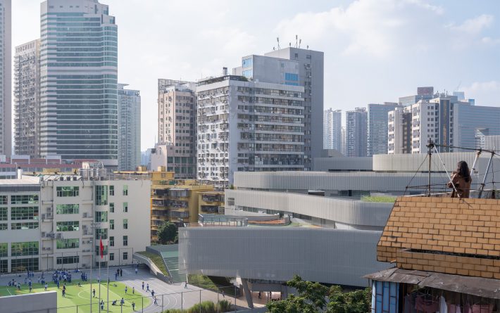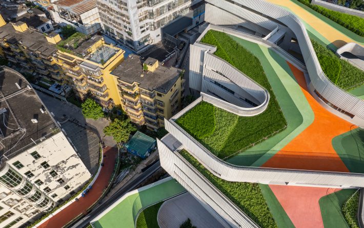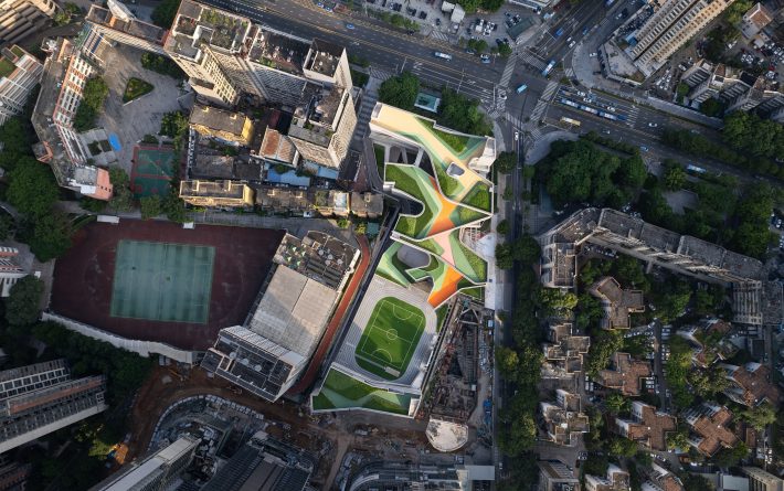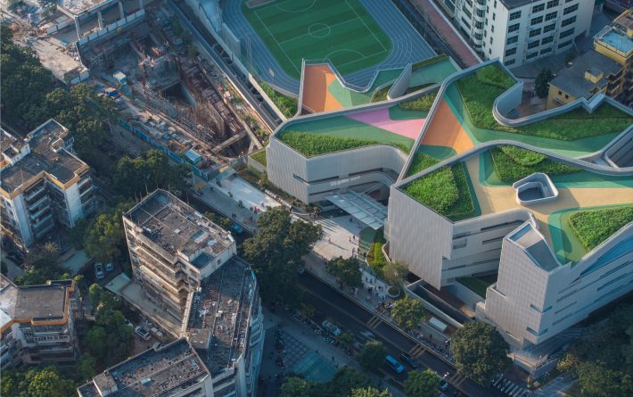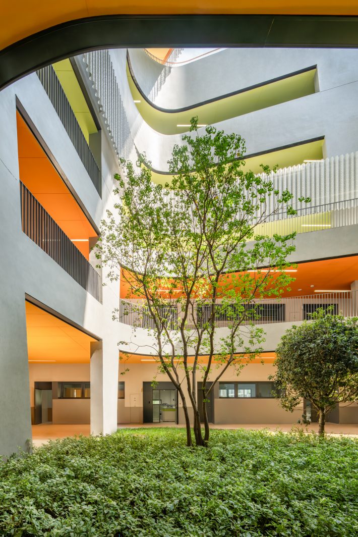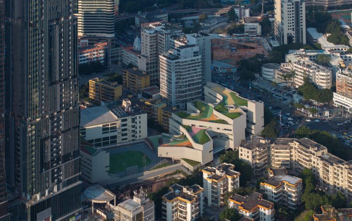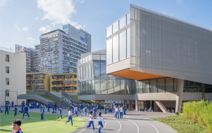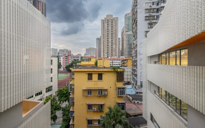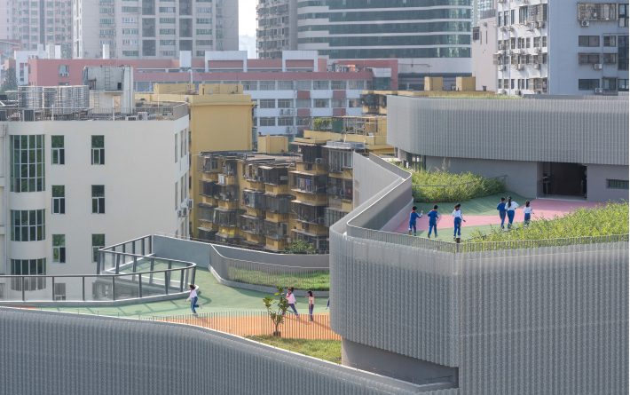 翠竹外国语学校是一座建筑面积为44030平米的小学,位于深圳市罗湖区老城内。罗湖区是深圳市历史最为悠久、密度最高的区域,拥有最不规则的城市肌理。翠竹外国语学校位于城市主干道旁,相邻建筑功能混杂,包括医院、住宅、商铺、以及其他学校,且场地狭长又不规整。在这样复杂拥挤的城市环境内,为学生带来一个舒适有趣的高密度校园,与周边环境形成独特的对话,是这个项目最大的挑战。