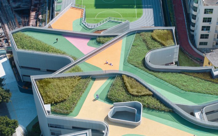 建筑师意图颠覆打破传统学校的设计方式,结合深圳的气候,打造一个水平延展、层叠交错的都市复合体,为学生们营造一个能在自然中学习的绿色校园。深圳的亚热带季风气候夏季炎热潮湿,日照充足、雨量充沛。翠竹外国语学校通过层层退台自由生长的屋顶花园、大楼板遮盖的半室外空间、微孔金属板遮阳格栅等一系列设计,将节能、环保与舒适结合在一起, 把深圳山海之间的习习凉风引入散布在各层的教学单元当中。无论风雨,学生都可以在校园内自由地穿行;无论夏冬,学生都可以在绿树掩映的半室外平台上互动、嬉戏,舒适自由地成长。