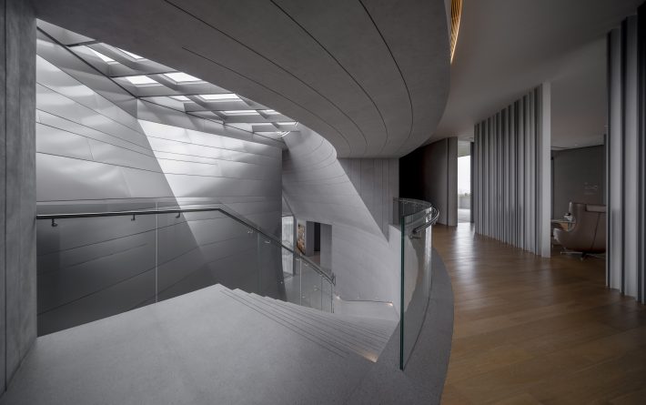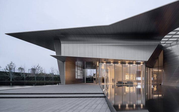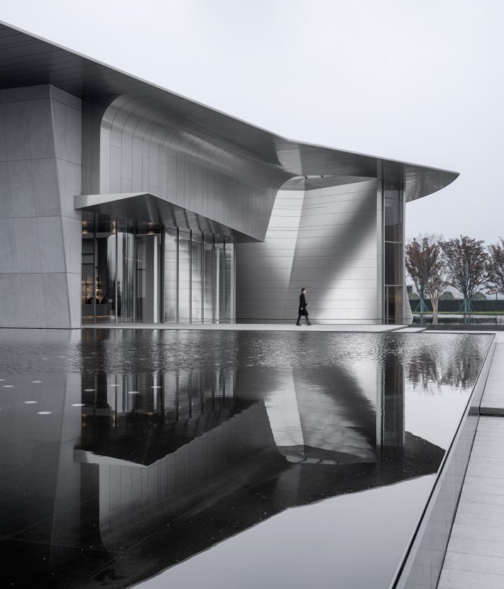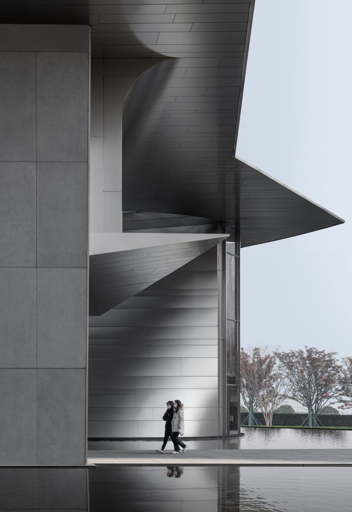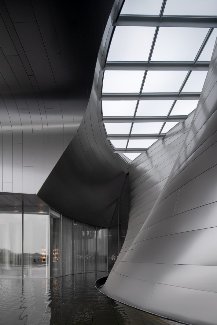 原本项目主立面朝北,南侧有一片绿地景观、水道和树阵,随着场地的更换,入口道路换至南侧,主立面也改为朝南,自然的树阵被遮挡住了。于是在建筑形式上,采用了一个水平向舒展开的屋面,屋面下的建筑主体部分是一个圆锥形的城市展厅空间,采用双曲拋物面的薄壳结构形式。建筑外表皮采用2mm厚的不锈钢曲面板,光线变化之间阴影投射在起伏的立面上,更加突显出建筑的体量和形体感,加强了南侧的入场感受性。结合广场上的水景倒影,一定程度上也弥补了原本平缓单调的景观面。