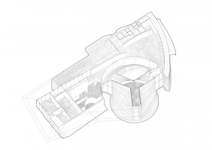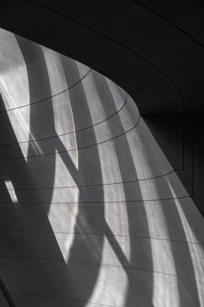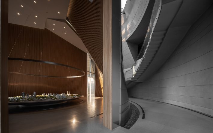 建筑内部空间我们也采用了很多与圆弧形母题相契合的室内设计元素。值得一提的是城市展厅的内部空间用温暖的木色包裹,空间的结构次序犹如一把逐渐打开的扇子,每根“扇骨”都是笔直的,但以一种微妙的方式打开,形成完美的弧面。这个扇形正与杭州亚运会的扇形Logo不谋而合,形成一种呼应关系。城市模型展台和上方的环型灯具通过精心的设计来控制其比例与空间关系的一体性。在此,建筑外部象征未来感的不锈钢面材与内部象征人性关怀的木色微孔板形成了强烈的反差。顶部的自然光从天窗倾洒进来,整个空间形成一座精神殿堂。