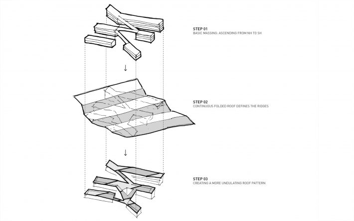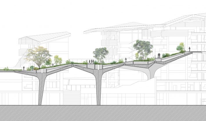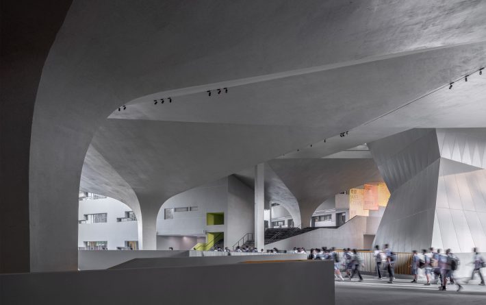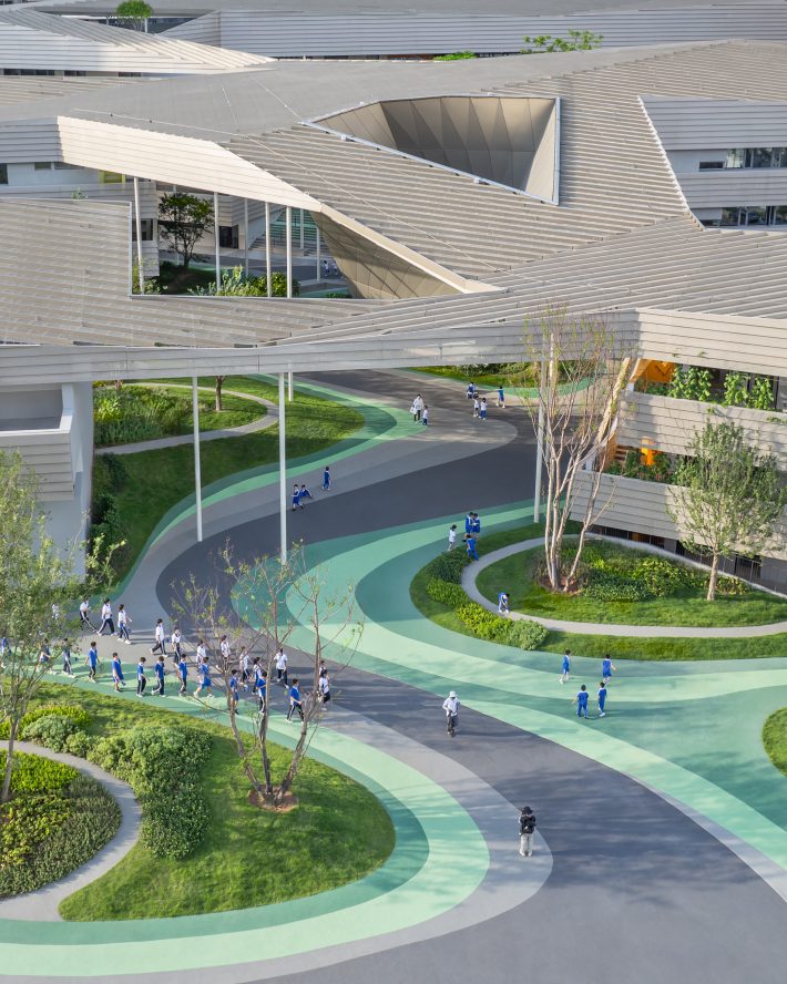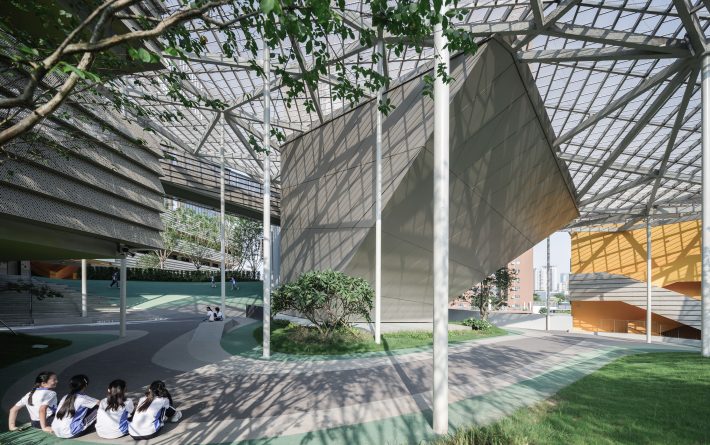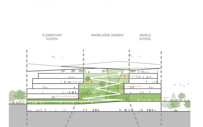 “知识绿毯”位于教学区的中部;绿毯之上是“知识花园” ,是一个提供了遮阳与自然通风的半室外空间。“创意平台”位于绿毯下部,为师生预设了灵活、创新的多功能“创学”空间。知识花园的中部是一棵“知识榕树”,将各个楼层竖向联通。榕树的根部扎根于校园的基座的图书馆区域, 为整个学校提供知识养分;中部将“创意平台”和“知识花园”联系在了一起;顶部冠盖设置了遮阳系统,师生们可以风雨无阻地在学校里穿行。