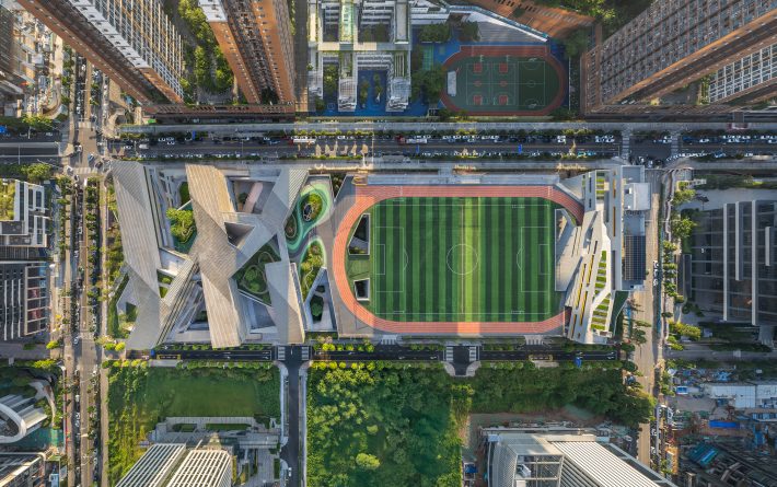 深圳前海桂湾学校位于深圳桂湾片区,场地西侧与北侧为城市绿地,拥有优美的自然环境。我们将学校打造成一棵巨大的“榕树”,通过根部的“ 习”空间,树干的“思”创意平台,上部的“学”知识花园,以及树冠的遮阳体系将整个校园串联成一个有机的学习环境。