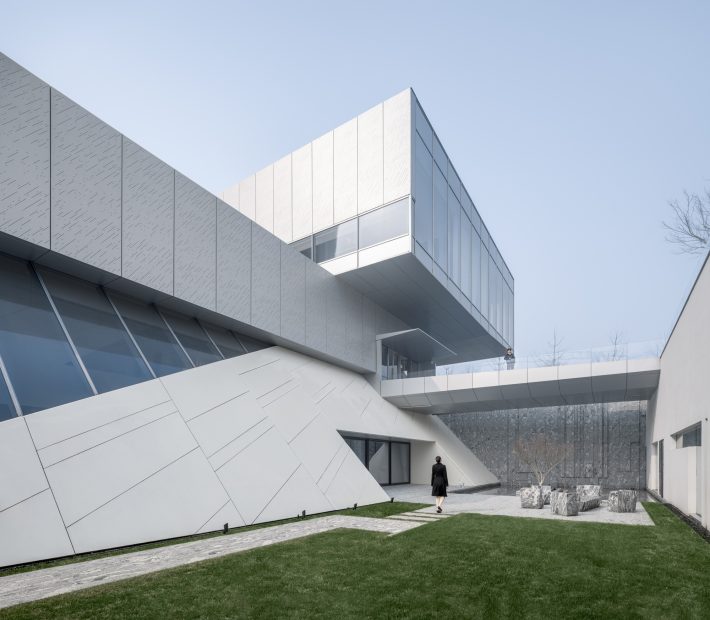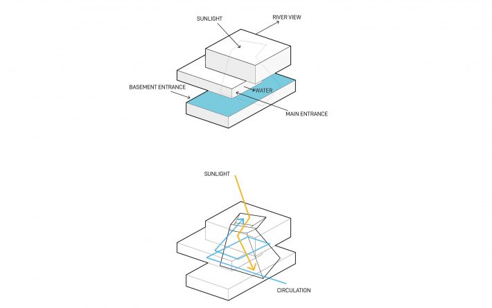 建筑清晰的体块在长江沿岸形成硬朗的造型,建筑内部一个贯穿各层的光井借助漫反射的柔和光线把整个建筑空间串联起来,形成一个由上而下的光的庭院,给使用者营造舒适典雅的空间感受。光是我们在项目中着重探讨的元素。为了把猛烈的直射光转化为柔和的漫反射光,我们根据当地的阳光高度角设计了多个成角度的反射面,在建筑中心形成了由漏斗与反漏斗形组合的巨大光井空间,让光可以在墙面之间来回反射,从地上二层弥漫至地下一层。
