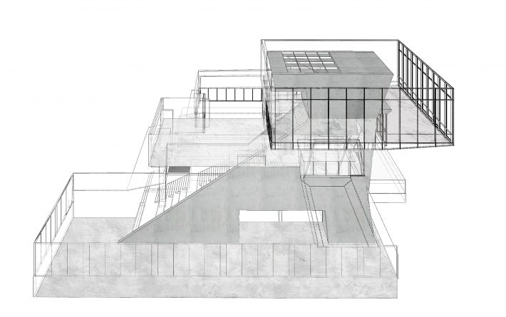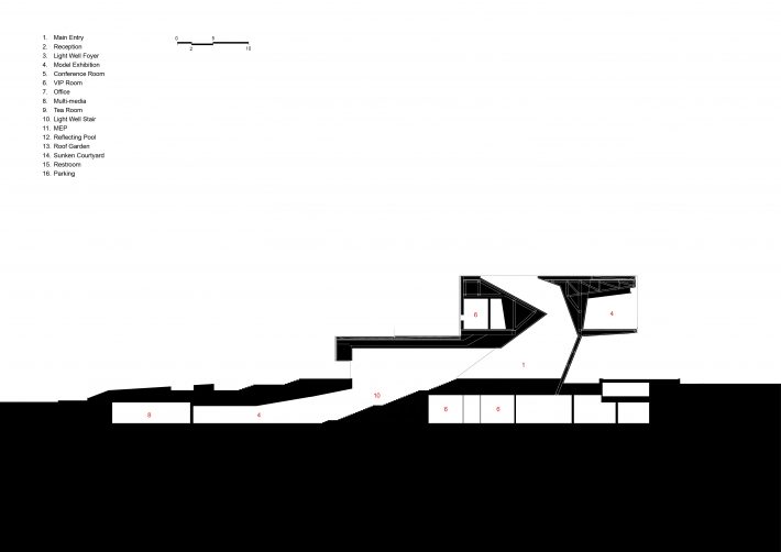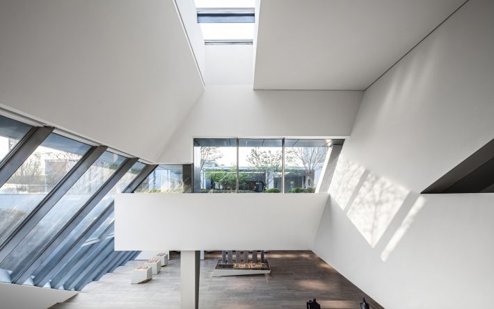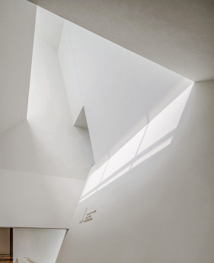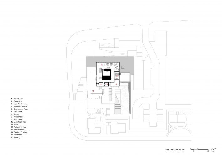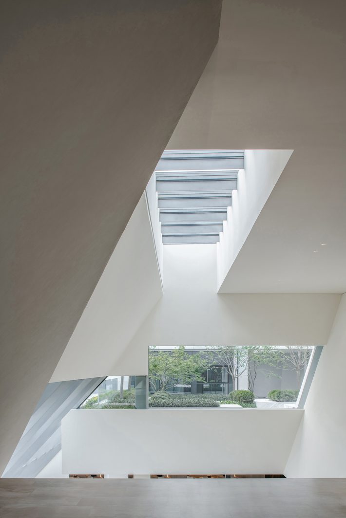 光井由上而下将整个建筑竖向串联起来,在首层成为重要的沙盘展示区的光源的同时,也形成了一个“光的庭院”。 每层的体块都具有属于自己的独立功能,在销售的同时,也可在各层举行不同的沙龙、艺术、酒会等活动,使用效率高。