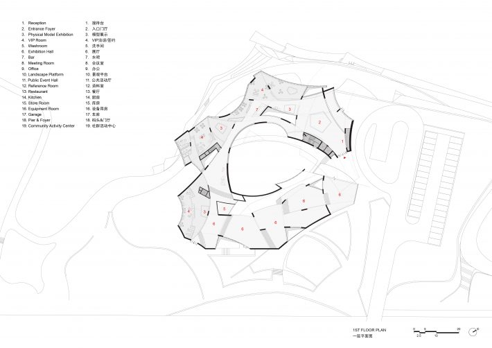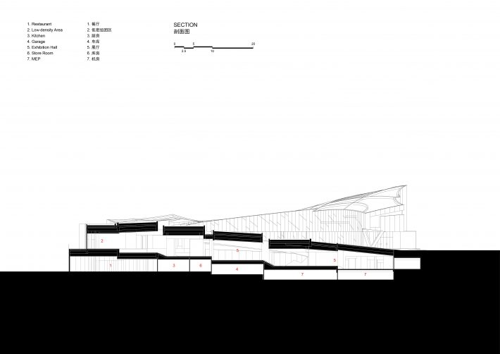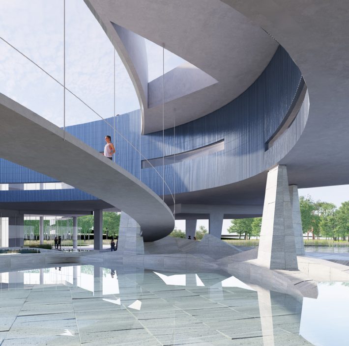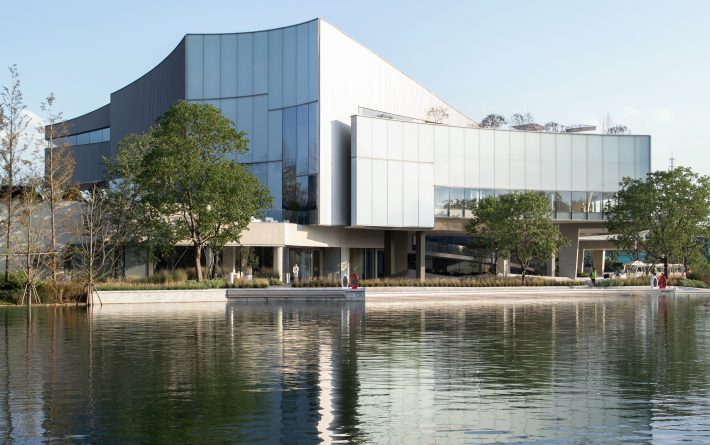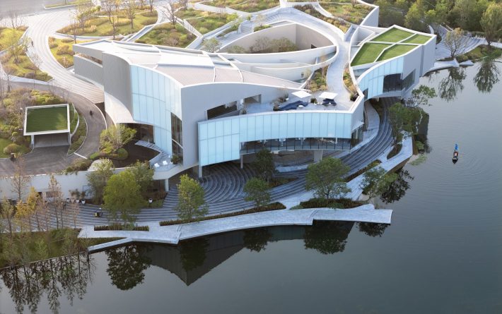 Adopting a “courtyard” strategy, the dual ground floors seamlessly connect different elevation levels between the road and the waterfront. Inspired by ripples, the architectural design revolves around water as a continuous spatial theme, with soft curves defining dynamic spaces that offer an ever-changing visitor experience. The rooftop is divided into a civic plaza, hilltop garden, and lake-view corridor, using curves to shape undulating rooflines that enhance the building’s prominence. Over water, dynamically designed suspended ceilings elevate the riverfront pedestrian experience, enriching the spatial use perception on the sales floor.