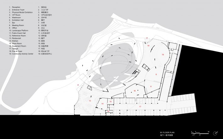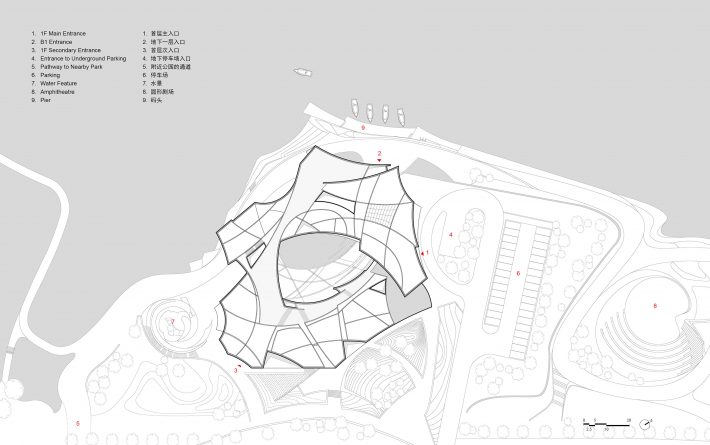 Landscape design extends architectural techniques to integrate building, landscape, and interior spaces seamlessly. Undulating ground blocks encircle inner courtyards, delineating terraced water features, skylit courtyards, roof pathways, and greenery, creating a diverse exploration path. Curved sections become crucial landscape interfaces, with concave curved surfaces defining semi-transparent curtain wall areas that serve as significant landscape windows, emitting uniform diffuse lighting externally. At night, the building resembles a translucent glass mirror, casting beautiful reflections on the water’s surface.
